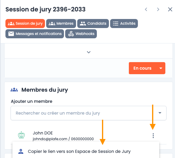 Depuis votre session de jury, il est possible de directement copier le lien "manuellement" dans l'espace jury de vos membres existants :