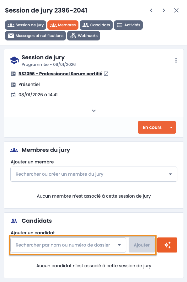 —> Directement depuis l'onglet Dossiers, choisissez un dossier de certification et ajoutez-le depuis une session existante dans le raccourci "session de jury" :