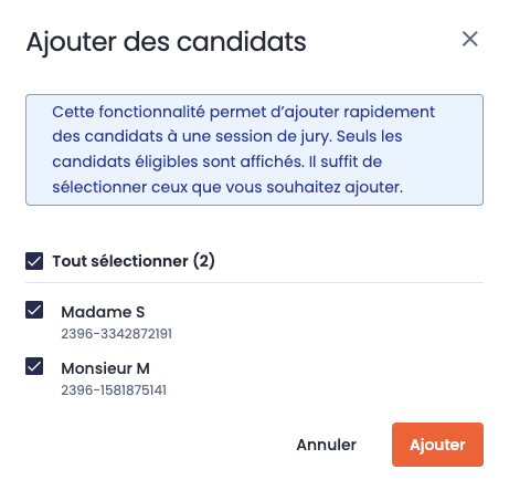 Depuis la page de la session de jury, le bouton Affectation automatique vous permet d’assigner en un clic un groupe de candidats à votre session.