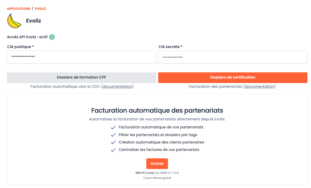L'application Evoliz vous permet de générer automatiquement les factures dans votre compte Evoliz pour vos partenaires OF, directement depuis CertiPlace.