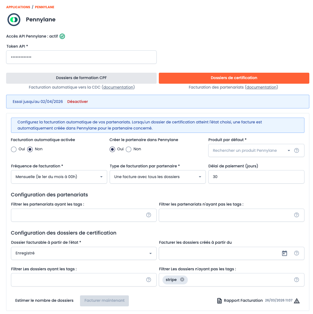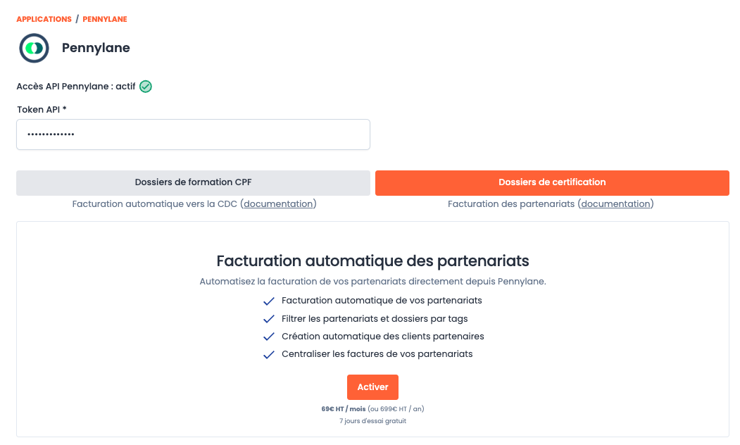 L'application Pennylane vous permet de générer automatiquement les factures dans votre compte Pennylane pour vos partenaires OF, directement depuis CertiPlace.