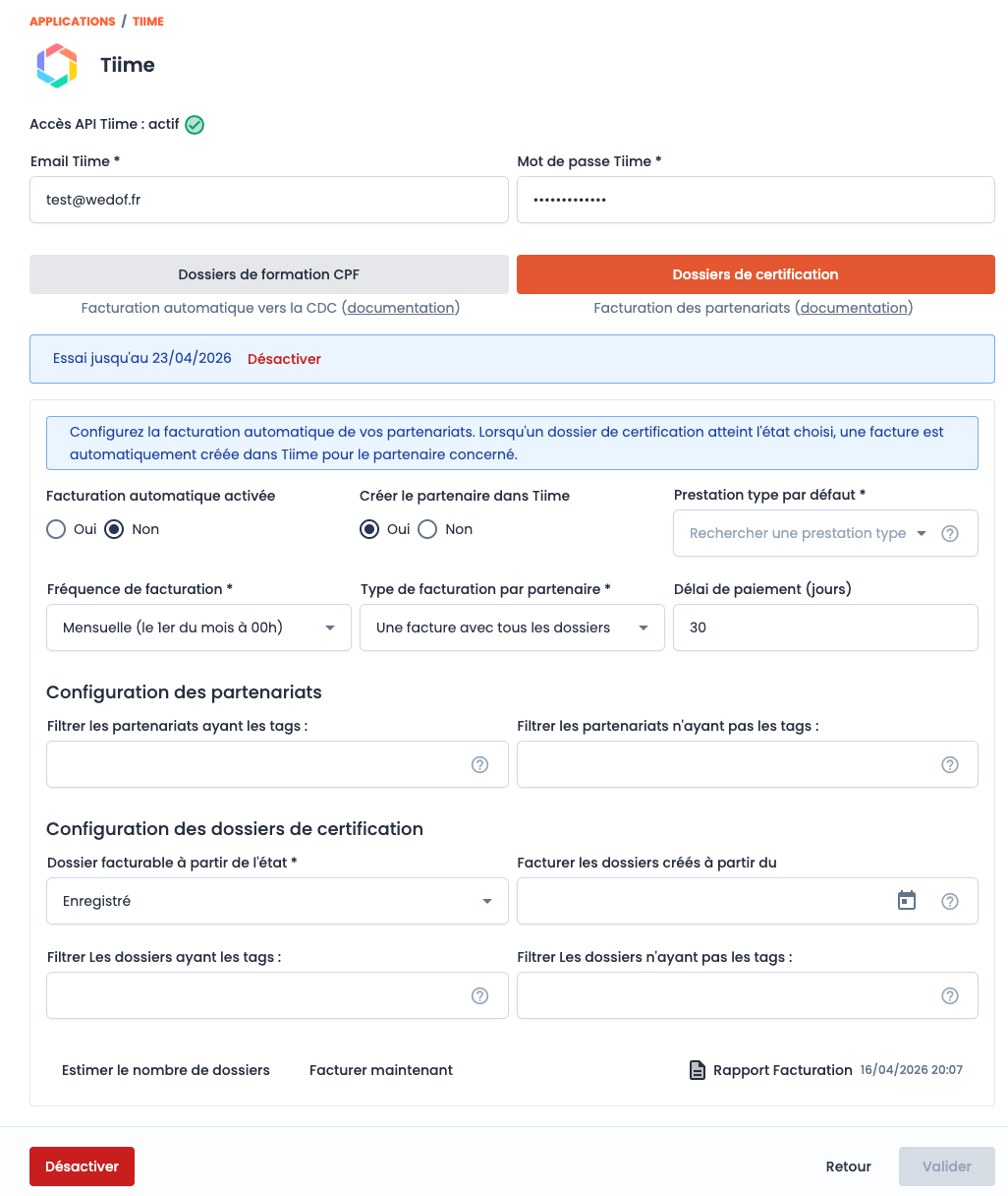 Note : un dossier de certification déjà facturé ne sera pas refacturé lors des exécutions suivantes.