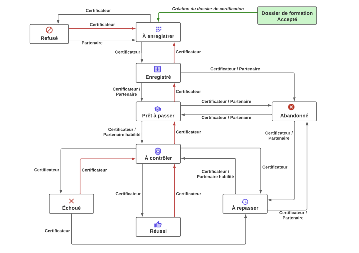 À contrôler : le candidat a passé l'examen de certification, le certificateur doit contrôler le résultat et décider de l'obtention ou non de la certification. Depuis l'état À repasser, le certificateur doit contrôler le résultat et décidé de l'obtention ou non de la certification après que le candidat ait repassé l'examen de certification.