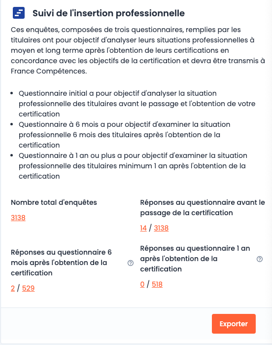 Les réponses aux questionnaires de vos candidats peuvent être exportées sur chacune de vos certifications depuis l'espace "Certifications & partenariats" - "Suivi de l'insertion professionnelle" :