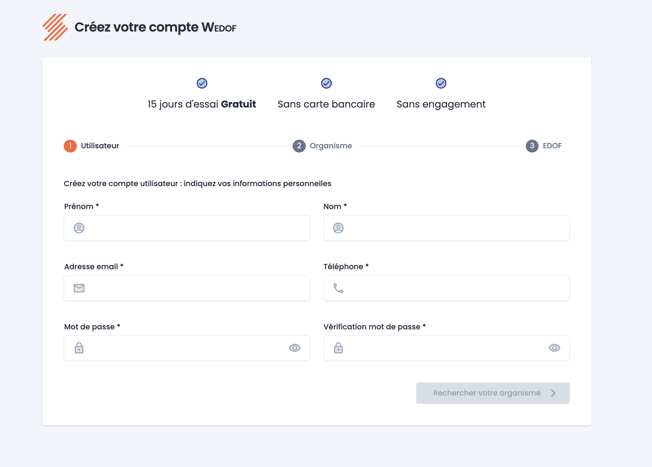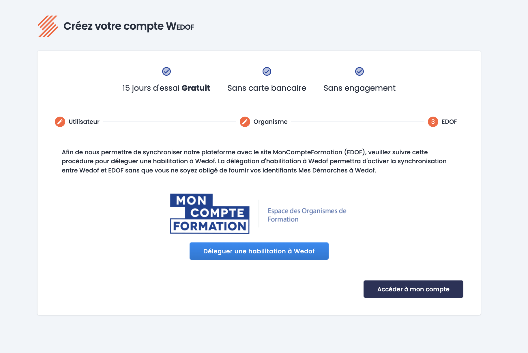 - Étape 3 : la prochaine étape consiste à associer le compte Wedof que vous êtes en train de créer avec MonCompteFormation et l'Espace des Organismes de Formation (EDOF) si votre organisme est également un organisme de formation. Cela nous permettra de synchroniser les dossiers de formation de votre organisme avec nos services.