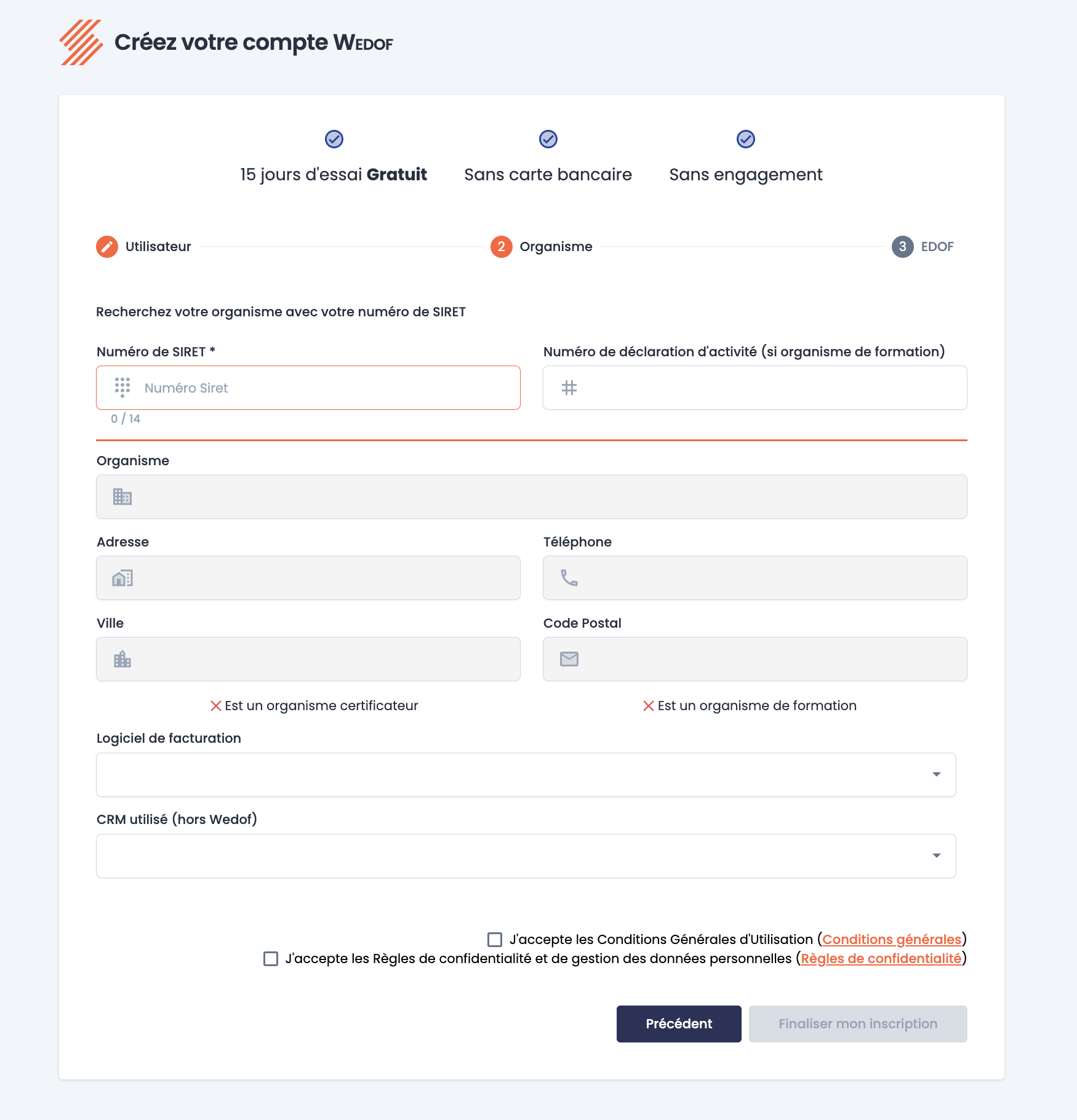 - Étape 2 : vous devez indiquer le numéro de siret de votre organisme.